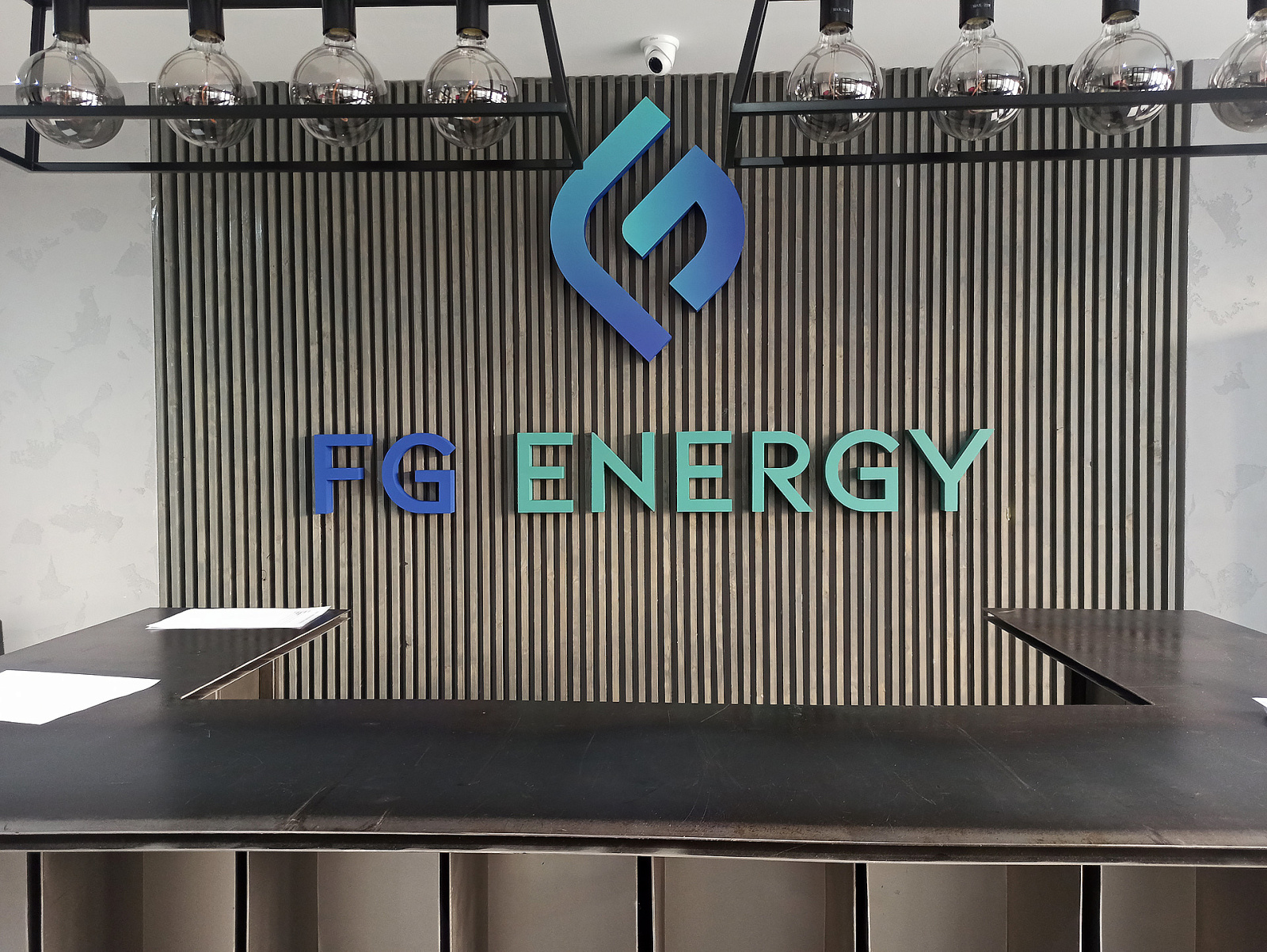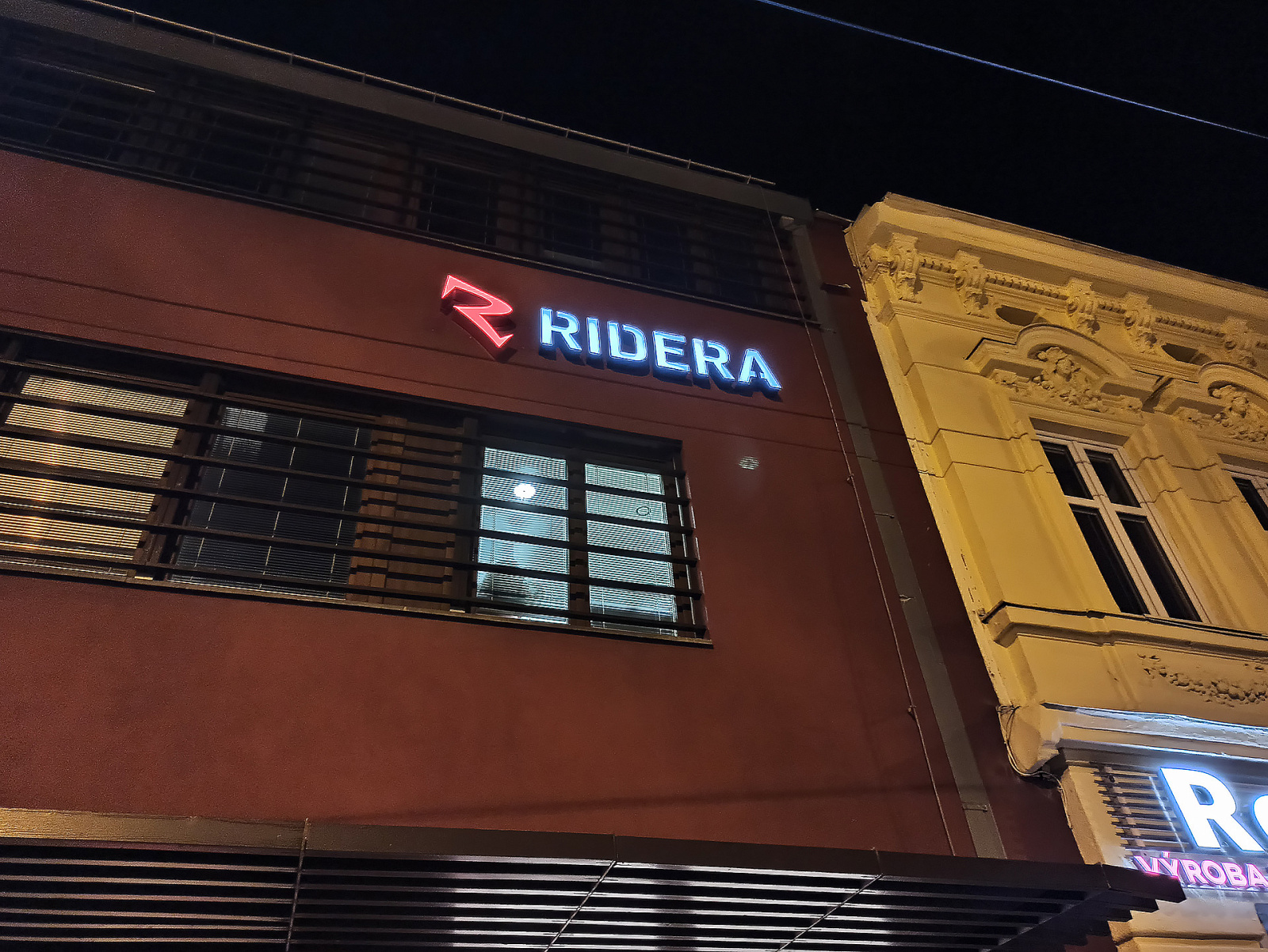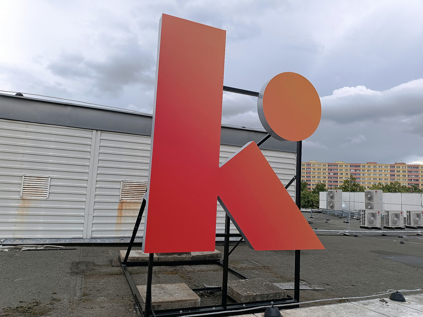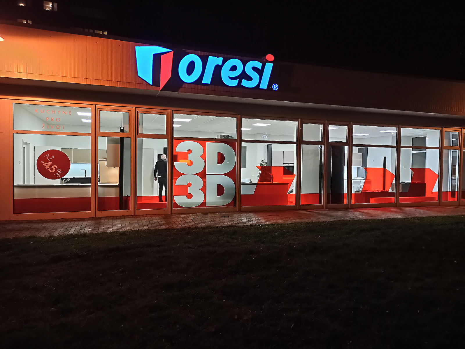 - 3D logo osvětleno ze zadní části, světlo se odráží od fasády.