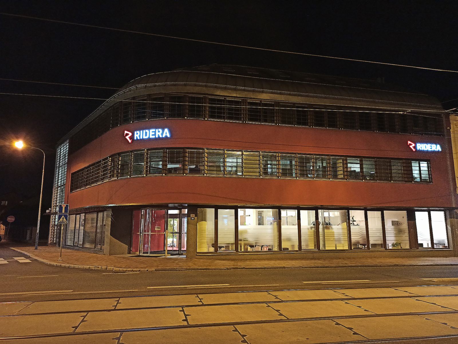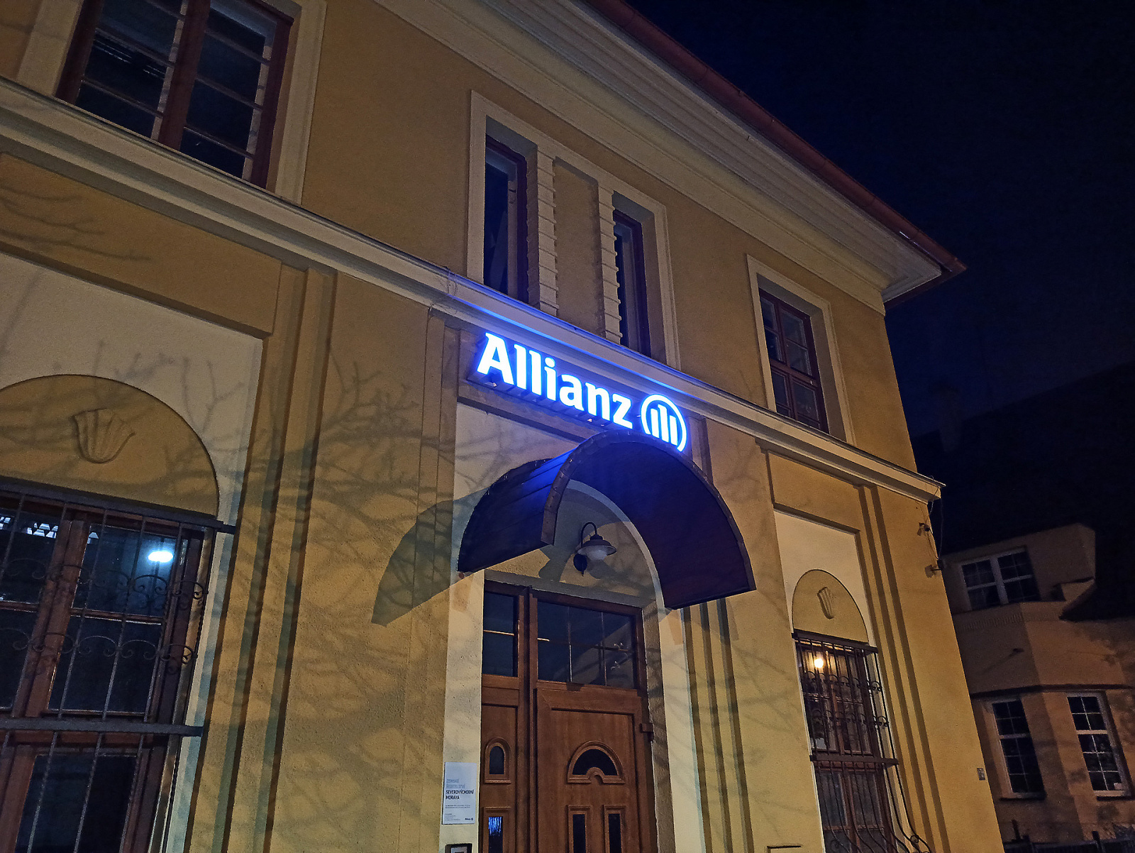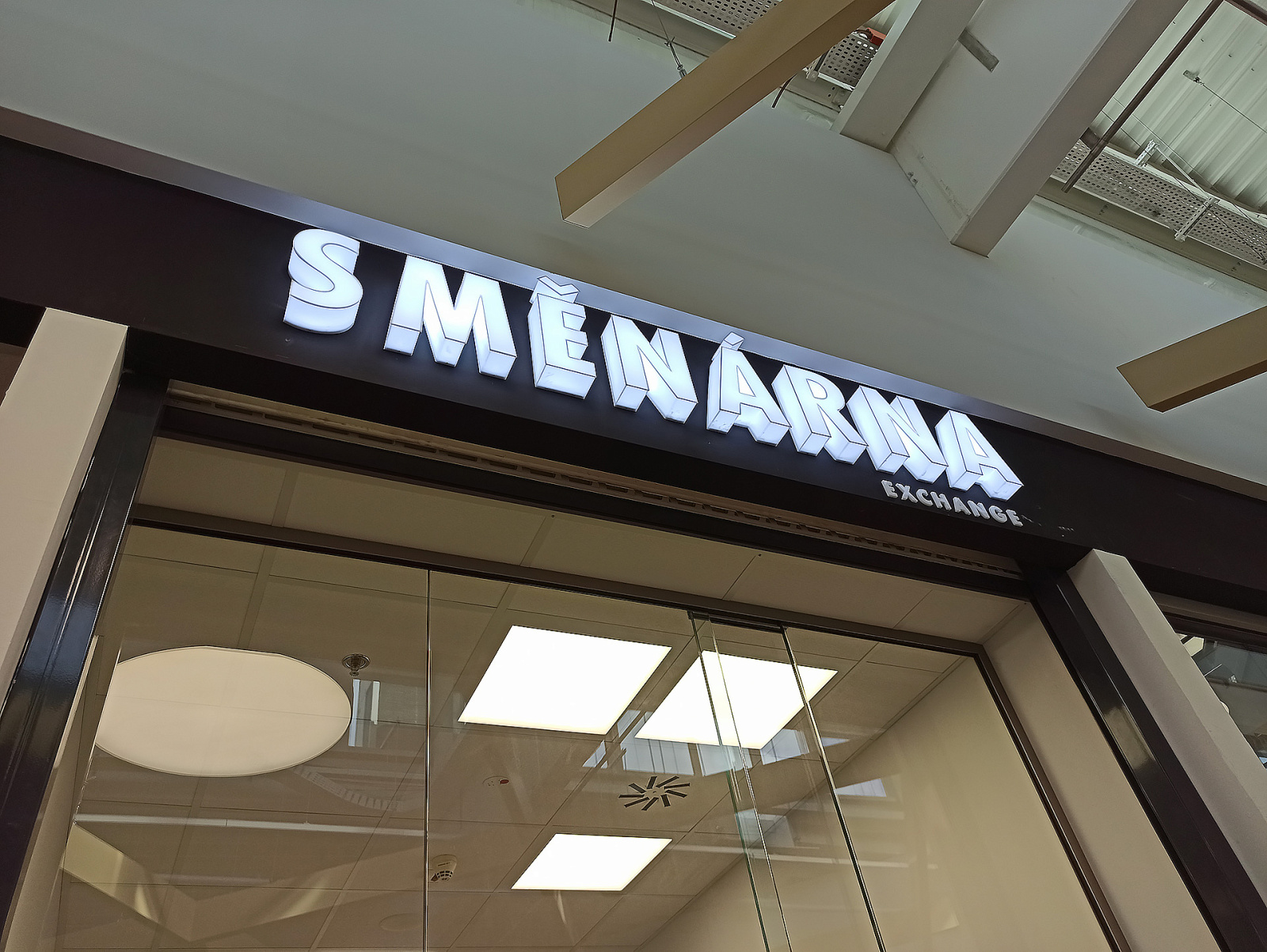 - 3D logo osvětleno ze zadní části, světlo se odráží od fasády.